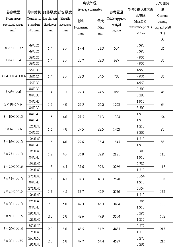 | 生產范圍 Production range of cable型號 Type額定電壓 Rated voltages V芯數 NO.of cores標稱截面 Nominal cross-sectional area mm2主線 Principal line地線 Ground wire控制線 Controlled lineU*10003112.5~70UP*10003112.5~70UY ●MY380/66031—4~70UYP ●MYP380/66031—4~70UYP ●MYP660/114031—4~70UC*1000312~710~50UC ●MC380/660313~716~50UCP*1000312~710~50UCP ●MCP380/660313~716~50UCPQ*114031335~70UCP ●MCP660/114031335~95UZ ●UZP ●MZ MZP300/5003112.5~4UYQ ●MYQ300/5002~12——1.0~2.5 |